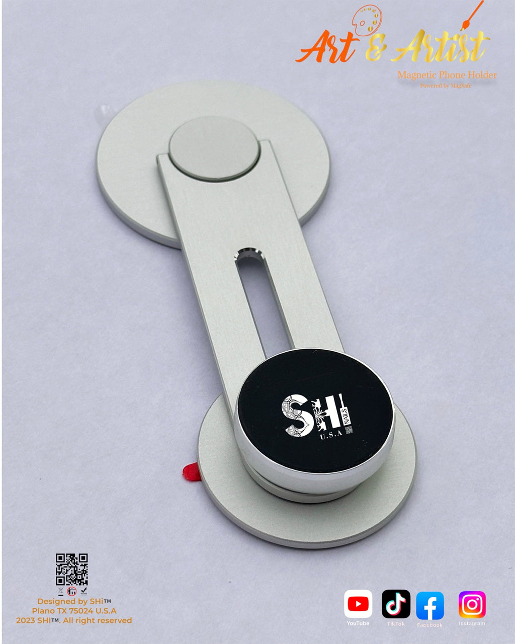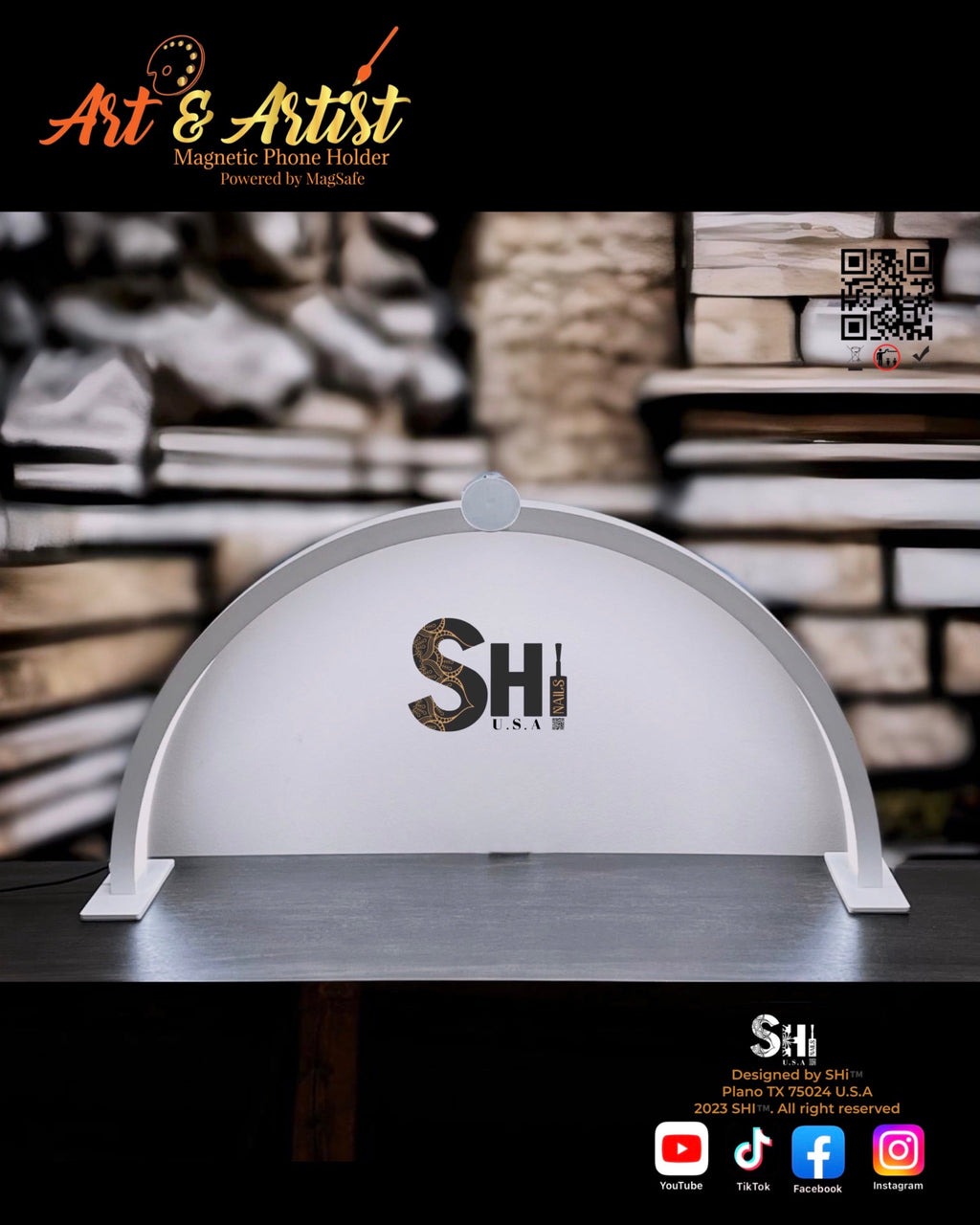 "Calling all content creators! Are you tired of juggling your phone while trying to capture the perfect shot? Look no further than SHi's Art & Artist Half Moon Arc LED Table Lamp System—the ONLY lighting system with an exclusive MagSafe magnetic phone holder. This revolutionary feature allows you to effortlessly record your content while keeping your hands free to work their magic."